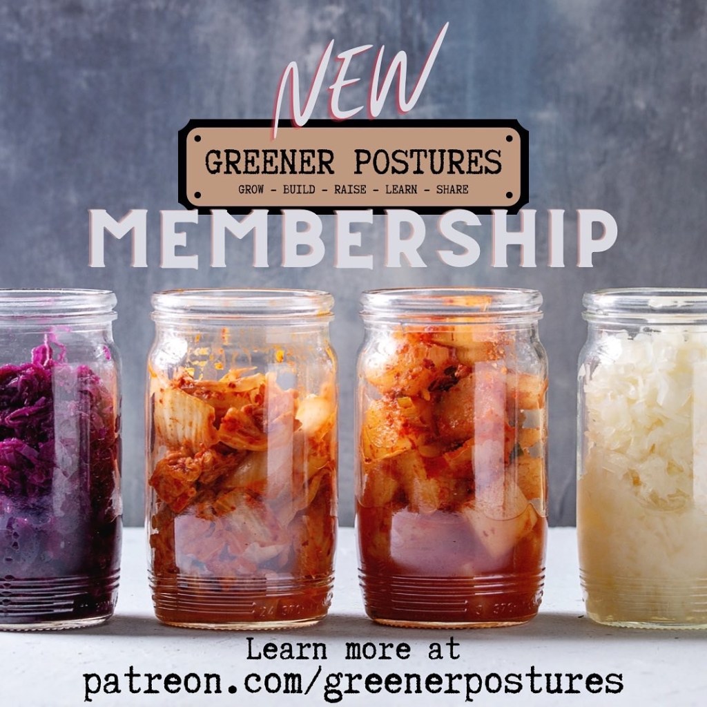 Announcing The Greener Postures Membership! Yes, that’s right, you can now sign up, subscribe, become a member, show your support and get exclusive content and online learning opportunities from me, Lanni @greenerpostures! I have a few different levels that I offer with different perks, so go check out all the details at PATREON.COM/GREENERPOSTURES. There will be bonus podcasts, video tutorials, workshops, group zoom calls, recipes and more. If you’ve been enjoying The Greener Postures Podcast and the Preserving Today YouTube videos, nothing much will change there. It will remain free for all, but I will have new and exclusive content and engagement inside the membership.