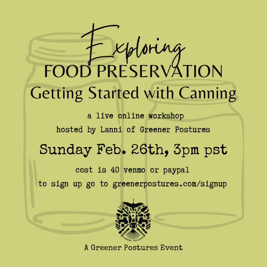 I’m excited to announce that I will be holding a live online workshop on Sunday, February 26th at 3pm PST. We will go over canning safety, how it works, water bath canning, pressure canning, equipment, recipes and more! This will be LIVE on Zoom. I’ll be in my kitchen showing how I work canning into my normal kitchen routine. To sign up to to greenerpostures.com/signup or for more information click HERE.