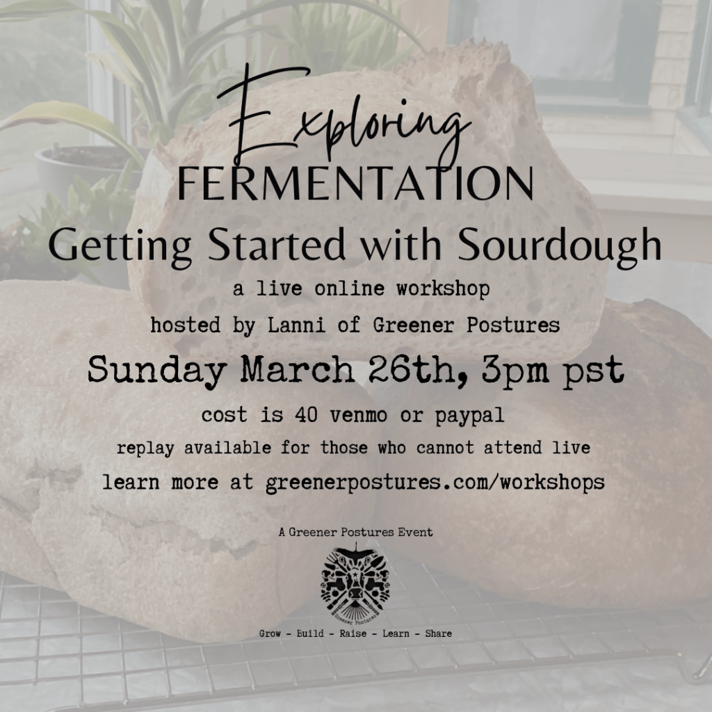 I’m going to end this month long conversation about all things sourdough with the Getting Started with Sourdough Workshop ONLINE Sunday March 26th at 3pm pst. This will be an excellent workshop for both beginners and sourdough enthusiasts. Join me in my kitchen (virtually) where I will cover everything from how I care for starter to baking bread and using discard. The workshop comes with by PDF sourdough book and lifetime access to the Greener Postures community so we can continue the conversation after the workshop. Learn more by clicking HERE.
